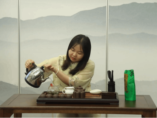 管理工程学院辅导员、中级茶艺师韦珍安老师以一曲《云水禅心》古筝曲为背景,为现场观众带来行云流水般的茶道表演。她手持白瓷茶具,通过“沐霖瓯杯”等经典手法,将藤茶的色香味形展现得淋漓尽致。表演间隙,韦老师结合茶艺教学经验,向国际友人解读“和静怡真”的茶道精神,并指导中外学生体验执壶斟茶的礼仪要领。