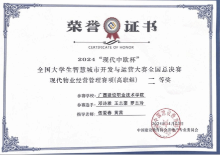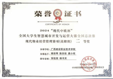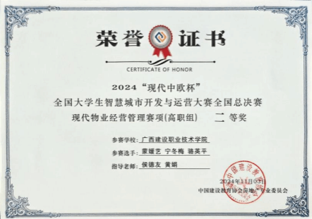 广西建院11月5日讯(管理工程学院 侯德友)11月3日,由中国建设教育协会指导、中国建设教育协会房地产专业委员会主办,石家庄学院和北京现代中欧软件开发有限公司联合承办的2024“现代中欧杯”全国大学生智慧城市开发运营大赛全国总决赛在石家庄学院举办。经过激烈角逐,由乐鱼全球最大体育平台_乐鱼(中国)管理工程学院现代物业管理专业9位学生组成的三支队伍均获得现代物业经营管理赛项(高职组)二等奖。