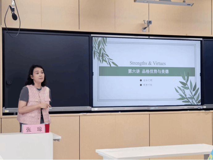 张琼老师以“积极心理视角下的大学生心理健康教育”为主题进行教学设计。上午,她围绕“品格优势与美德”开展“自我意识”主题的示范授课。课程以“蓬勃人生的PERMA理论”导入,设计“自知之明”授课环节讲解:人为什么要认识自己。用“明贵千秋”授课环节讲解如何认识自己,最后解析“美德六维度”帮助学生挖掘自身能力促进心理成长。