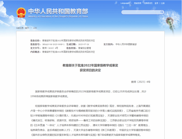 据悉,国家级教学成果奖每四年评选一次,是教育部为了奖励取得教学成果的集体和个人,鼓励教育工作者从事教育教学研究,提高教学水平和教育质量而设立的最高级别的奖励。