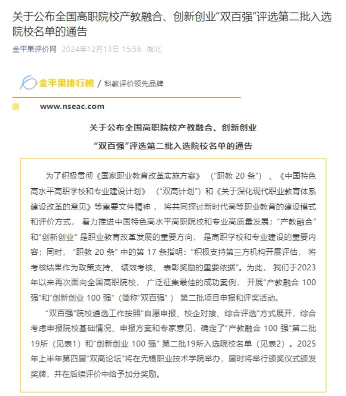 学校入选 “产教融合100强” 第二批院校