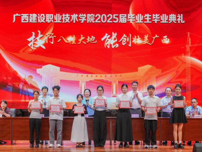 会上宣读了自治区级、校级优秀毕业生表彰文件。土木工程学院苏雯等69名毕业生荣获“2025届广西壮族自治区普通高等教育优秀毕业生”称号,乐鱼全球最大体育平台_乐鱼(中国)规划学院黄秋凤等607名同学荣获“乐鱼全球最大体育平台_乐鱼(中国)2025届优秀毕业生”荣誉称号。与会领导为受表彰的优秀毕业生代表颁发荣誉证书。