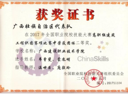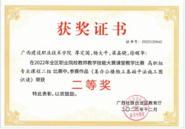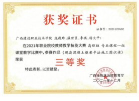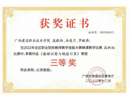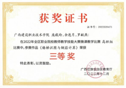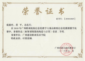 在2018年广西职业院校信息化教学大赛高职组信息化微课教学比赛中,参赛作品《框架梁纵筋的构造与计算》荣获二等奖 | 在2022年全区职业院校教师教学技能大赛微课教学比赛中,参赛作品《楼梯识图与钢筋计算》荣获三等奖 |