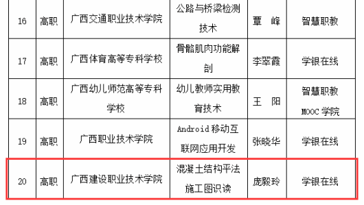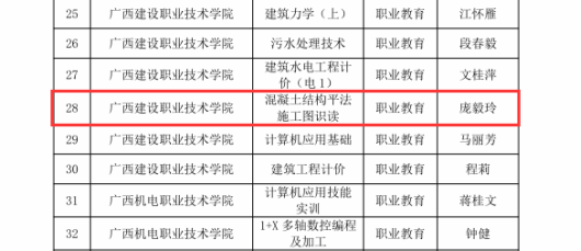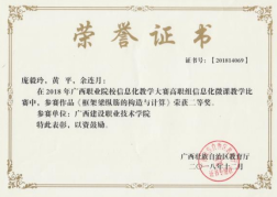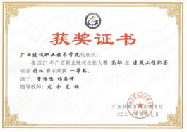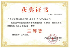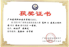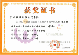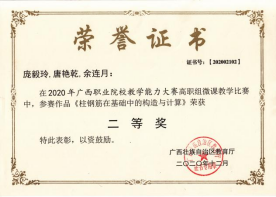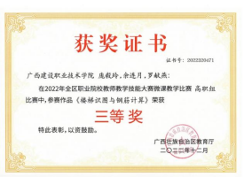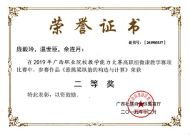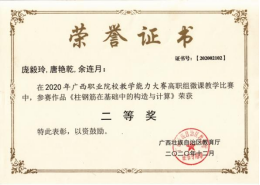 在2020年广西职业院校教学能力大赛高职组微课教学比赛中,参赛作品《柱纵筋插入基础中的构造与计算》荣获二等奖 | 在2019年广西职业院校教学能力大赛高职组微课教学赛项比赛中,参赛作品《悬挑梁纵筋的构造与计算》荣获二等奖 |