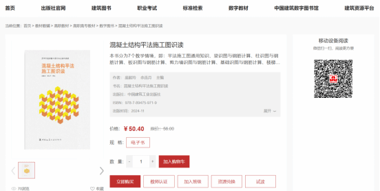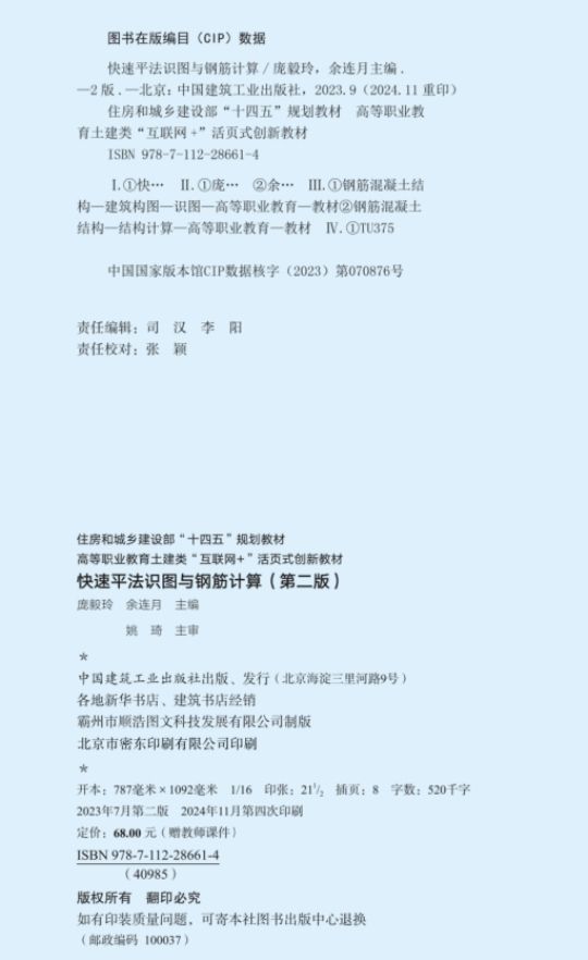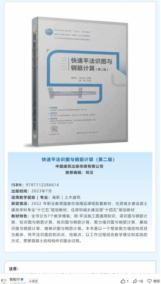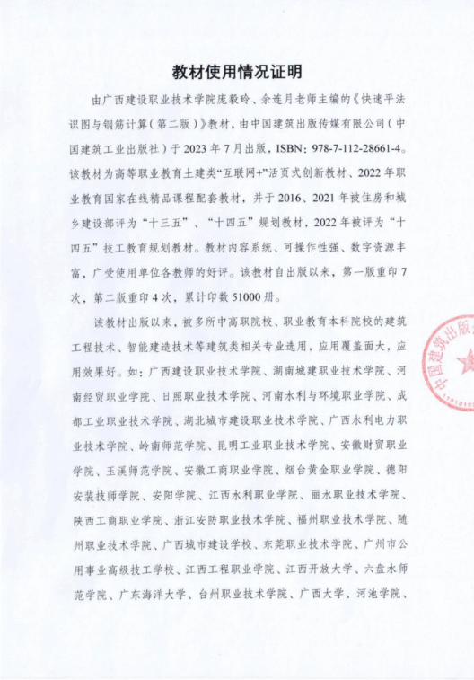 二是根据22G101图集及时更新并再版,目前已有近百家学校采用本教材。 本教材自2021年8月首版后,半年销量突破1万册。2022年11月22G101新版图集发布后,团队迅速启动研究工作,于2023年1月完成再版编撰,并于2023年7月在全国率先出版发行,实现与新规范无缝对接。目前,教材已在近100所学校中使用,应用效果显著。