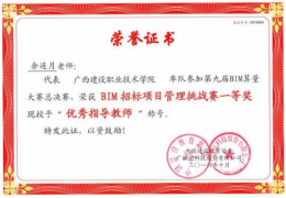 余连月指导学生参加第八届BIM算量大赛总决赛获一等奖,被授予“优秀指导教师”称号 | 指导学生参加第九届BIM算量大赛总决赛获一等奖,被授予“优秀指导教师”称号 |