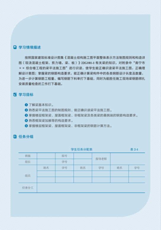 一是校企协同,组建多元教材开发团队打造高质量教材。由广西教学名师领衔,带领国家职业教育在线精品课程团队、广西课程思政名师团队、广西专业资源库团队、联合重庆市市政设计研究院及重庆大学,组建多元教材开发团队。团队均为双师型教师,主编拥有15年以上企业经历。团队以分析典型工作任务,对接专业标准,以“土木乐鱼全球最大体育平台_乐鱼(中国)工程技术人员”岗位需求为导向,以培养平法施工图识读能力为核心,选取实际项目为载体,采用项目引导、任务驱动方法,构建“任务+案例+学训”教学情境,打造“教学训”一体化教材。