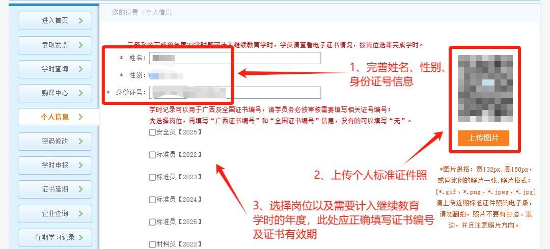 (四)完善信息:点击“个人信息”,完善自己的个人信息、岗位信息,上传个人照片。岗位后的年份是需要计入继续教育学时的年度。点击“保存”;