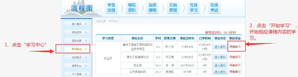 (六)课程学习:点击“学习中心”,在对应课程处点击“开始学习”,学习过程中,请留意打开电脑的摄像头并全程面对电脑;