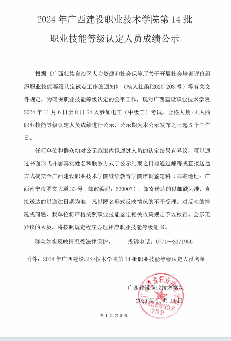 培训信息 当前位置: 首页 >> 培训信息 >> 正文 2024年乐鱼全球最大体育平台_乐鱼(中国)第14批职业技能等级认定人员成绩公示 发布日期:2024-11-15 点击: 附件【2024年乐鱼全球最大体育平台_乐鱼(中国)第14批职业技能等级认定人员成绩公示.pdf】已下载次