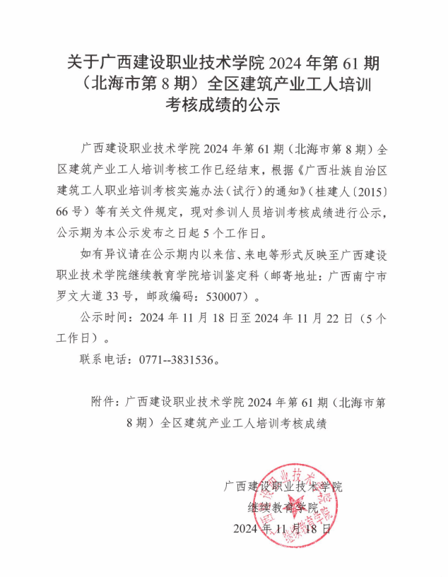 培训信息 当前位置: 首页 >> 培训信息 >> 正文 关于乐鱼全球最大体育平台_乐鱼(中国)2024年全区乐鱼全球最大体育平台_乐鱼(中国)产业工人第61期(北海市市第8期)培训考核成绩的公示 发布日期:2024-11-18 点击: 附件【关于乐鱼全球最大体育平台_乐鱼(中国)2024年全区乐鱼全球最大体育平台_乐鱼(中国)产业工人第61期(北海市市第8期)培训考核成绩的公示.pdf】已下载次