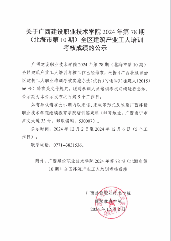 培训信息 当前位置: 首页 >> 培训信息 >> 正文 关于乐鱼全球最大体育平台_乐鱼(中国)2024年全区乐鱼全球最大体育平台_乐鱼(中国)产业工人第78期(北海市第10期)培训考核成绩的公示 发布日期:2024-12-02 点击: 附件【关于乐鱼全球最大体育平台_乐鱼(中国)2024年全区乐鱼全球最大体育平台_乐鱼(中国)产业工人第78期(北海市第10期)培训考核成绩的公示.pdf】已下载次