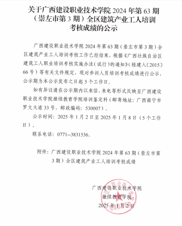 培训信息 当前位置: 首页 >> 培训信息 >> 正文 关于乐鱼全球最大体育平台_乐鱼(中国)2024年全区乐鱼全球最大体育平台_乐鱼(中国)产业工人第63期(崇左市第3期)培训考核成绩的公示 发布日期:2025-01-02 点击: 附件【关于乐鱼全球最大体育平台_乐鱼(中国)2024年全区乐鱼全球最大体育平台_乐鱼(中国)产业工人第63期(崇左市第3期)培训考核成绩的公示.pdf】已下载次