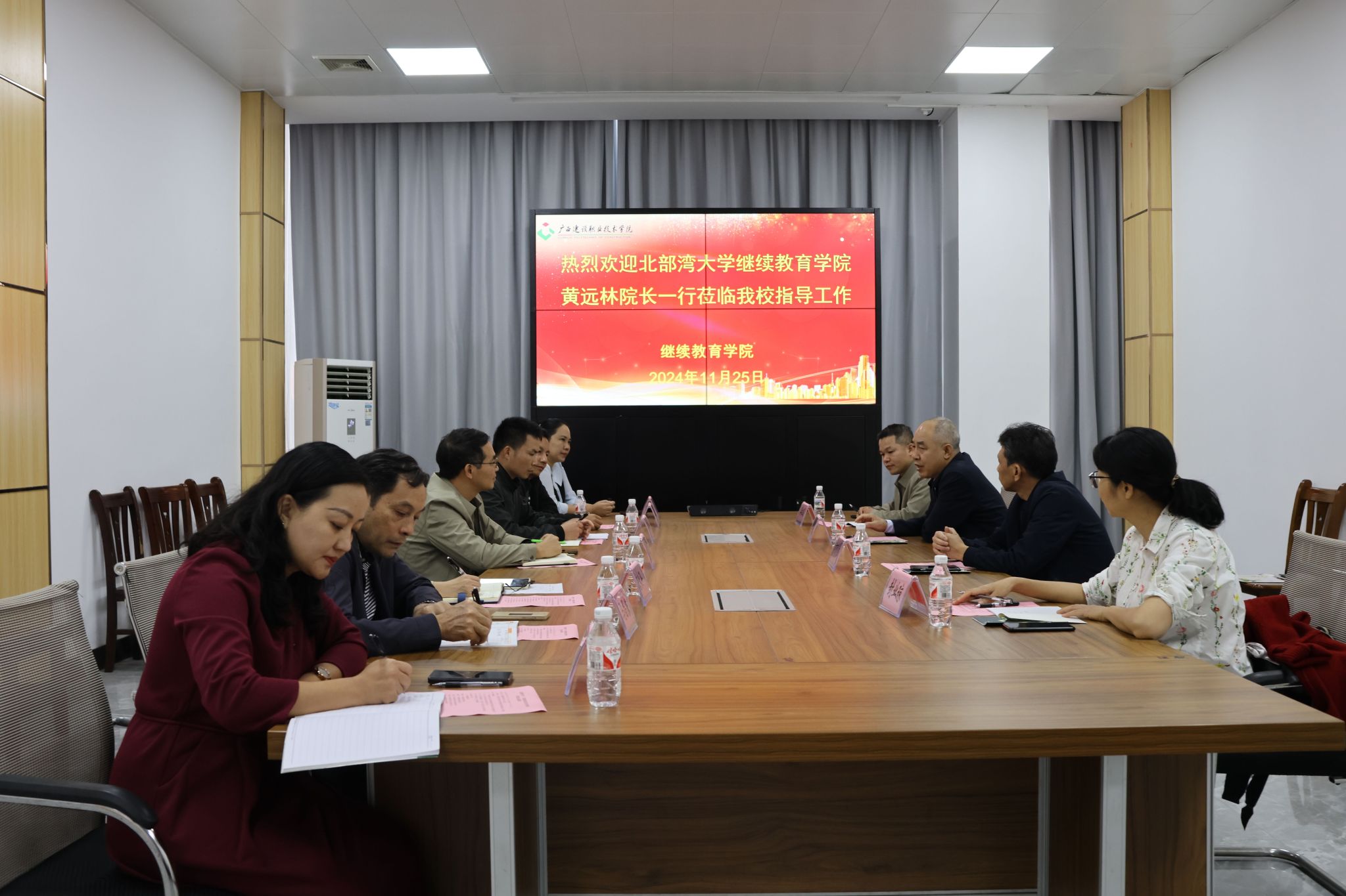 广西建院11月26日讯(继续教育学院 陈剑梅)2024年11月25日下午,北部湾大学继续教育学院黄远林院长、封彬贤副院长、学历教育科宾祖昌科长和封业琼老师一行4人莅临乐鱼全球最大体育平台_乐鱼(中国),对乐鱼全球最大体育平台_乐鱼(中国)高等学历继续教育自学考试专升本衔接工作进行调研、指导和交流。乐鱼全球最大体育平台_乐鱼(中国)继续教育学院胡飞鹏副院长、信息工程学院覃一海副院长、土木工程学院唐未平主任及相关人员参加了座谈。