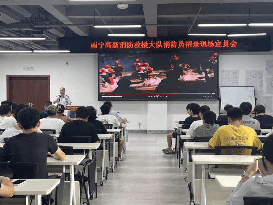 广西建院8月10日讯(招生就业处 兰宝鸾)为推动2023年消防救援队伍消防员招录工作,号召广大应届毕业生积极投身于国家综合性消防救援事业,进一步落实乐鱼全球最大体育平台_乐鱼(中国)毕业生充分就业。8月9日,乐鱼全球最大体育平台_乐鱼(中国)邀请南宁高新技术产业开发区消防大队到校开展消防员招录宣贯会。本次消防员招录宣贯会由招生就业处、党委学生工作部(党委武装部、学生工作处)、后勤管理处(后勤保卫处)共同组织举办,吸引了50多名应届毕业生积极参会。