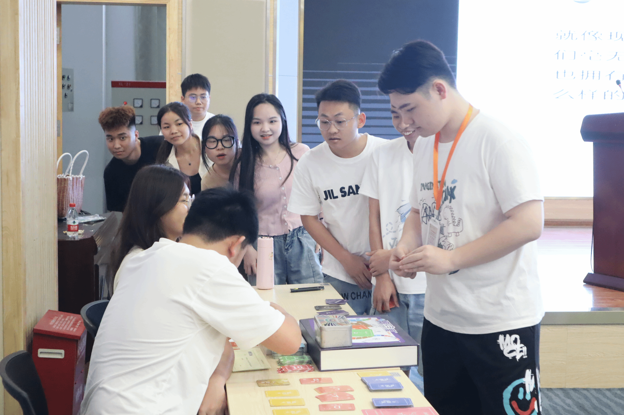 该项活动共举办了五场,每场次120人。活动期间,李澜歆老师随机分为8组开展进行游戏。游戏根据人生历程分为青葱岁月、燃情岁月、峥嵘岁月、大结局四个阶段,有金币的交易,筹码的流通,工作的变换,无常的发生,社会环境的起落,还有各种人际交往与互动,很大程度地还原一个人的一生;缴纳生活成本、获得职业回报、选择职业转换、经历周期起伏,人生的种种体验都浓缩在这一场游戏当中,虽是虚拟的人生模拟游戏,但却能真真切切照见真实的人生,同学们能够身临其境的感受到人生的跌宕起伏、欣喜与失望、繁荣与衰退,获取经营人生的智慧与勇气。每场活动,同学们都在李老师的引导下沉浸式地参与其中,现场氛围十分活跃。