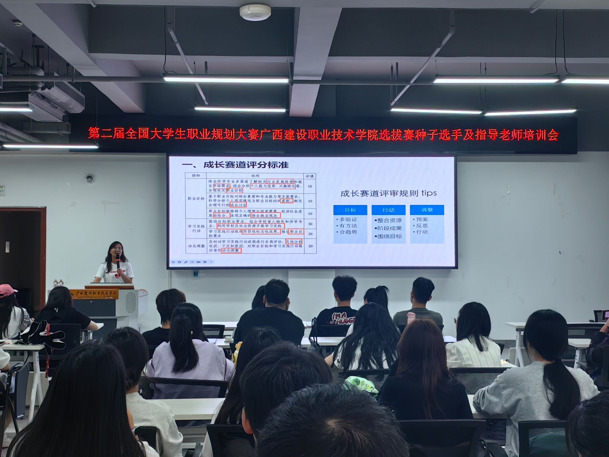 会上,林秀丽老师主要围绕“大赛的意义”“成长赛道解析”“就业赛道解析”三个方面为同学们详细地介绍了职业规划大赛的内容,解读大赛的规则,让同学们迅速对大赛有了清晰的认识,并从多维度深入浅出地解析了参赛要求、评审标准等,特别针对职业生涯规划书撰写注意事项、个人简历如何出彩等进行了详细说明。同时,围绕如何明确职业目标、如何探索成长方向和路径、如何做好自身职业规划、如何提升职业能力等方面进行了详细的阐述;鼓励同学们积极参赛,以此为契机,明确个人的职业规划方向,挖掘内在发展潜力、科学做好职业规划、有效提升就业能力。