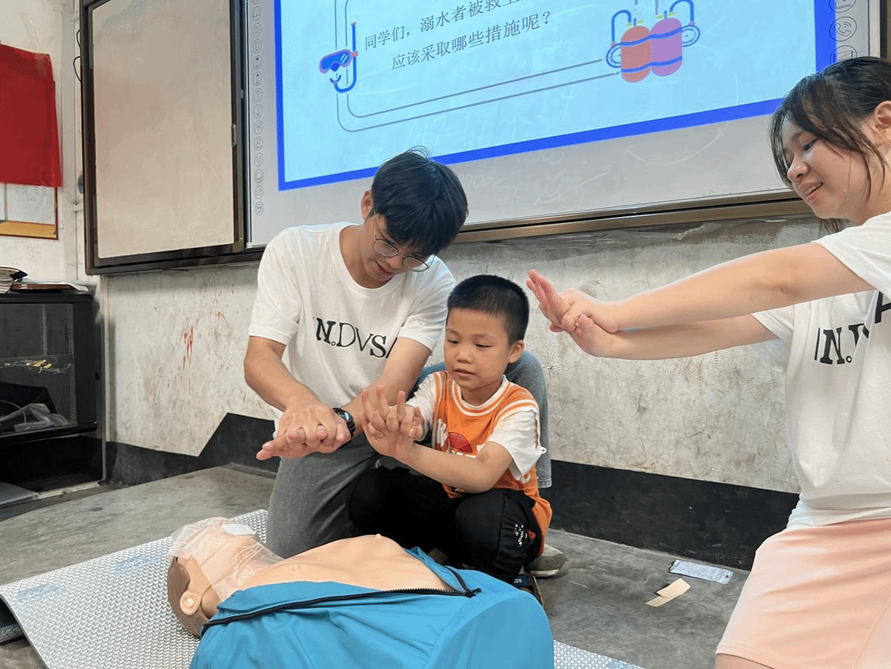 图为李峻宇在公益课进乡镇进小学普及防溺水与紧急救援知识