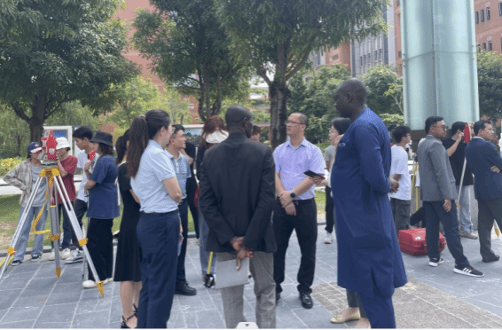 在自由交流环节,学院参会教师和嘉宾在人才培养模式改革、课程体系建设、师资队伍建设、信息化资源运用、科学研究等方面进行了深入交流,6位海外院校嘉宾对学院鲜明的专业办学特色、显著的办学成效和优良的教学效果给予了高度评价,并对学院的人才培养模式改革和课程体系建设产生了浓厚兴趣,期待与学院有更深层次的合作办学。座谈会后外宾观摩了学院《工程测量》的实践教学环节,并参观了毕业综合实训模型方向的实训成果。冈比亚应用科学工程技术大学的首席讲师Tayib Joof对《工程测量》中理实一体的教学方式表示认可,也对实操中学生团结协作、吃苦耐劳的精神表示赞赏。在参观毕业综合实训成果时,外宾高度赞扬了毕业综合实训的教学设计,也对实训中学生实操能力的提升表示认可,他认为在手工制作道路、桥梁、管道等工程构件时,学生在使用无人机进行测量、识读工程图纸、结构构造认知、动手实践能力等方面都得到锻炼。