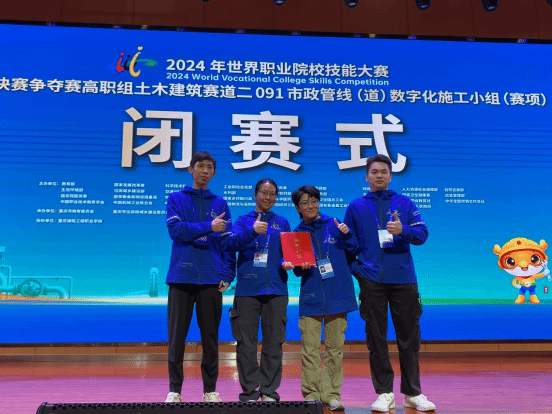 市政与交通学院10月27日讯(图/潘芳禄 文/潘芳禄 )2024年10月24至27日,由国家教育部、国家发展和改革委员会、国家科学技术部等35个部门主办的2024年世界职业院校技能大赛市政管线(道)数字化施工赛项总决赛争夺赛在重庆举办。经过激烈角逐,我院由靳丽莉副院长领队,梁志武、潘芳禄老师指导的甘宇秀、陈涛、甘雨珊、潘汉贵参赛队斩获铜奖。