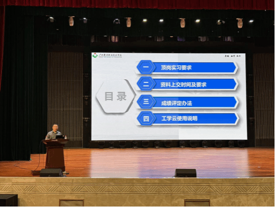 会上,刘海彬书记发表了激情洋溢的动员讲话,并围绕中国共产党的奋斗史,为学生们上了一堂深刻的思想政治教育课。他激励学生,在即将步入社会的岗位实习中,要继续发扬艰苦奋斗的创业精神。同时,刘书记还从实习、生活、交通、网络等多个方面,进行了全面细致的安全教育培训,旨在增强学生的安全意识和自我保护能力。随后,黄文珑副院长详细阐述了岗位实习的具体任务、成绩评定标准,并耐心指导学生们如何操作广西职业院校学生实习管理平台和工学云两个实习平台。