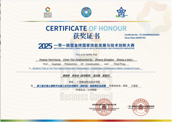 市政与交通学院7月3日讯(图/文 曾庆建)近日,2025 年一带一路暨金砖国家技能发展与技术创新大赛第三届交通土建数字化施工技术应用赛项(高职组)南部赛区选拔赛圆满落幕。我院学子陈润敏、李文轩、卢扬君、黄统平、黄艳崇、陈依依在指导教师曾丽莎、曾庆建的悉心指导下,凭借过硬的专业素养脱颖而出,一举斩获一等奖、二等奖、三等奖各1项,这是我院学子连续第3年在该赛项中荣膺一等奖,彰显了学院在交通土建数字化人才培养领域的过硬实力。