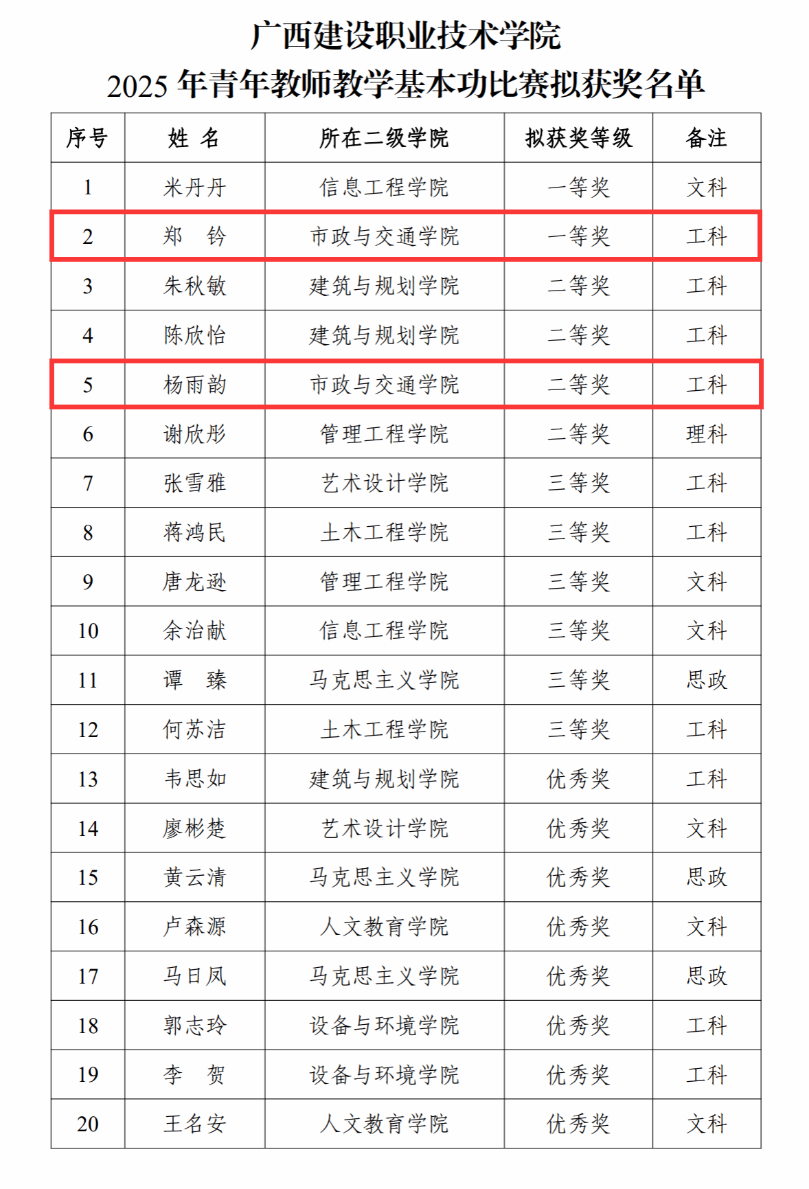 市政与交通学院12月19日讯 (文/方一帆 图/方一帆)近日,乐鱼全球最大体育平台_乐鱼(中国)2025年青年教师教学基本功比赛落下帷幕,本次比赛经各二级学院在预赛的基础上择优推荐20名教师参加决赛。经过激烈角逐,我院教师郑钤、杨雨韵在决赛中分别获得一等奖和二等奖的好成绩。
