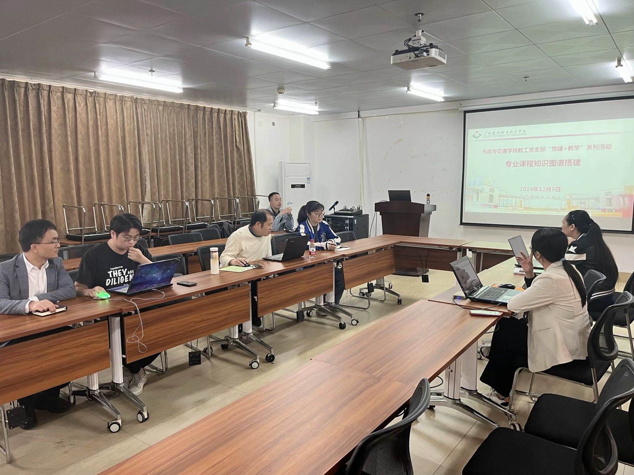 市政与交通学院副院长、教工党支部书记靳丽莉同志结合自身教学经历,介绍知识图谱助力教研创新的建设经验,并与参加活动的专业教师分享了知识图谱在提升课程建设、融通课程群建设、助力教学研究与创新、赋能人才培养等方面的心得体会。与会老师就知识图谱如何赋能教学创新展开交流讨论,现场互动氛围热烈。