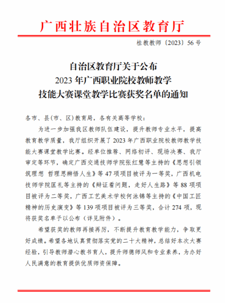 喜报:我院教师荣获2023年广西职业院校教师教学技能大赛课堂教学比赛一等奖