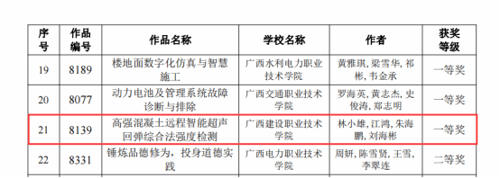 市政与交通学院825日讯(图/江鸿 /何秉润自治区教育厅刚刚公布的2023年广西职业院校教师教学技能大赛课堂教学比赛获奖名单中,我院林小雄、江鸿、朱海鹏、刘海彬老师组成的教学团队,携参赛作品《高强混凝土远程智能超声回弹综合法强度检测》荣获全区一等奖,这也是2023年乐鱼全球最大体育平台_乐鱼(中国)在该项比赛中唯一一项区赛一等奖。