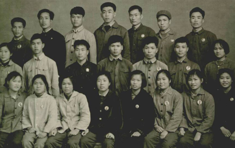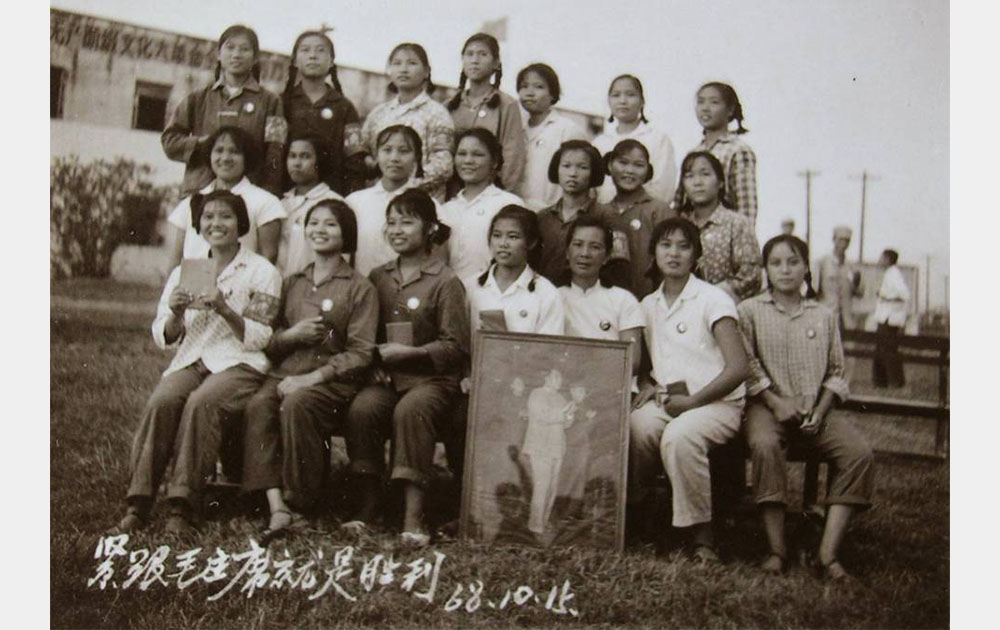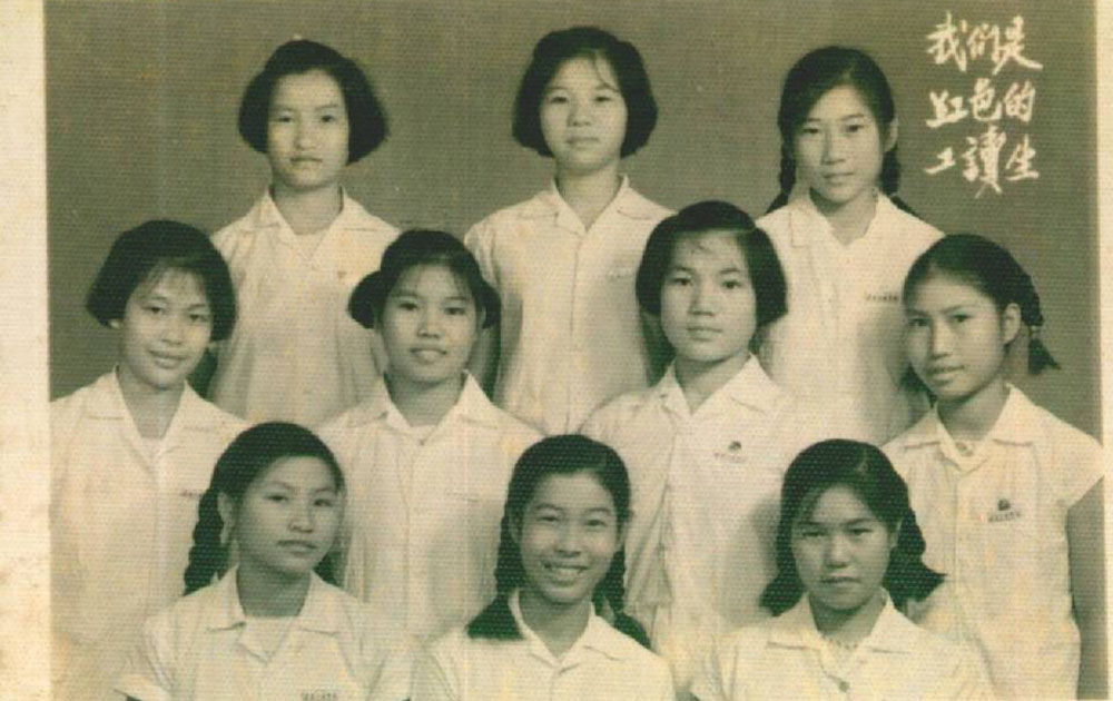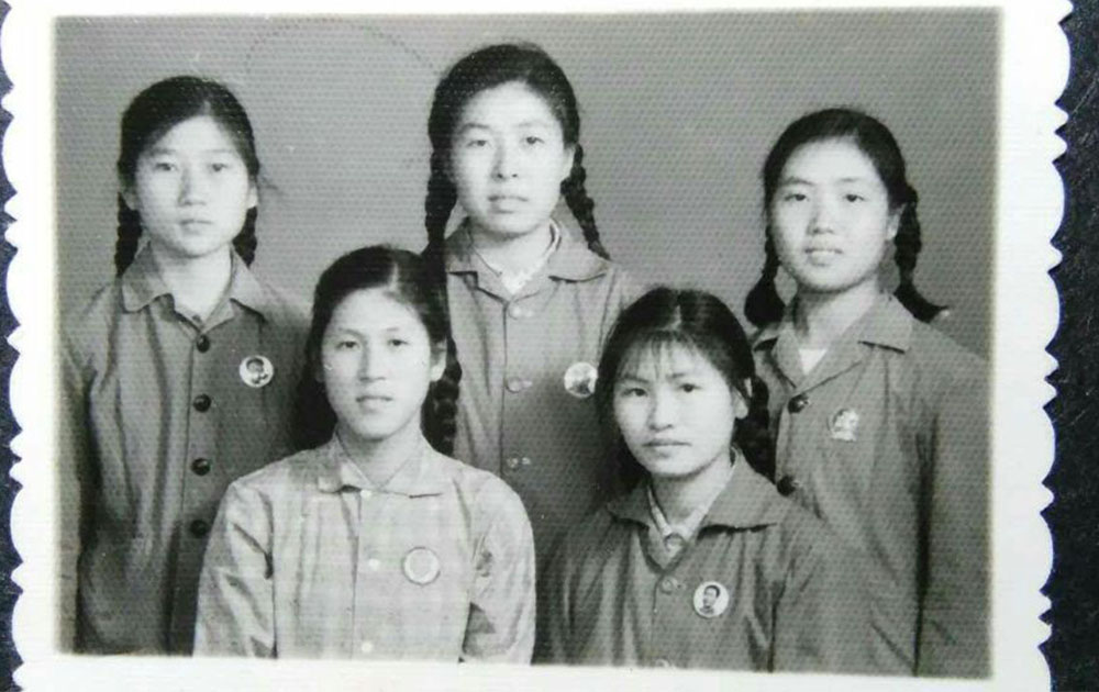 65级女生身着学校统一印发的工服拍摄毕业合影