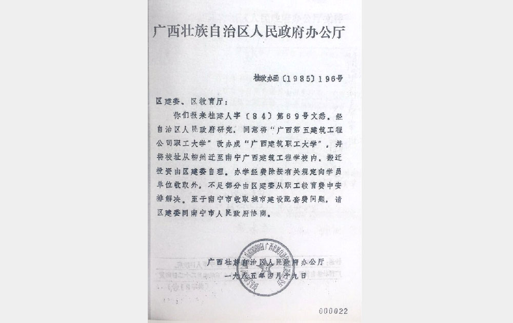 1985年元月,经自治区人民政府批准,在广西乐鱼全球最大体育平台_乐鱼(中国)工程学校同时增设“广西城乡建设环保学校”,并明文规定学校挂两块牌子,一套领导班子;同年11月,根据区人民政府办公厅桂政办函﹝85﹞196号文精神,批准广西乐鱼全球最大体育平台_乐鱼(中国)工程五公司职工大学改办成广西乐鱼全球最大体育平台_乐鱼(中国)职工大学,将校址由柳州迁至广西乐鱼全球最大体育平台_乐鱼(中国)工程学校内。至此,广西乐鱼全球最大体育平台_乐鱼(中国)工程学校、广西城乡建设环保学校和广西乐鱼全球最大体育平台_乐鱼(中国)职工大学三校一体,挂三块牌子,一套领导班子。教职工270余人,其中教师121人,校园乐鱼全球最大体育平台_乐鱼(中国)总面积32000平方米,藏书10万册。