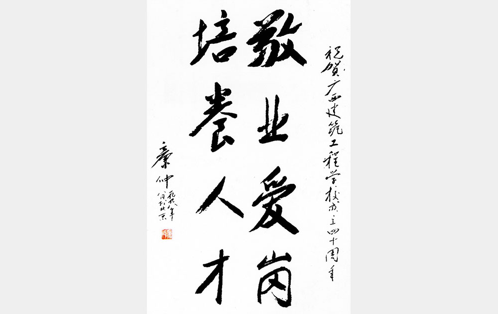 时任中国建设教育协会理事长(建设部顾问、原建设部副部长)廉仲贺40周年题词