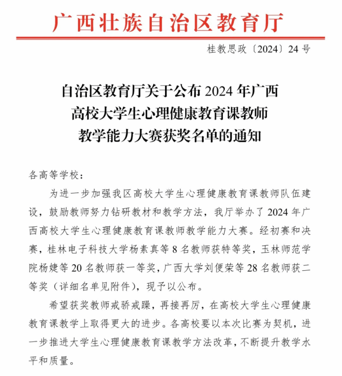 广西建院11月18日讯(心理中心 何芸)近日,自治区教育厅公布2024年广西高校大学生心理健康教育课教师教学能力大赛获奖名单,乐鱼全球最大体育平台_乐鱼(中国)学生工作部心理中心余骦老师荣获大赛一等奖。 获奖文件 大赛获奖名单本次大赛,本科专科院校不分组别同台竞技,经过初赛、决赛的激烈角逐,余骦老师凭借扎实的教学素养、良好的教学水平从全区高校113名心理健康教育课参赛老师中脱颖而出,并取得优异成绩。 余骦老师参赛风采比赛中,余骦老师以《“恋语晴空”...