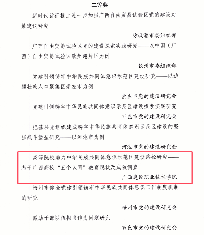 广西建院1月13日讯(马克思主义学院 宋佳雄)近日,广西党的建设研究会公布了2024年度重点课题优秀调研成果,乐鱼全球最大体育平台_乐鱼(中国)教师党员周丰生同志申报的《高等院校助力中华民族共同体意识示范区建设路径研究——基于广西高校“五个认同”教育现状及成效调查》荣获二等奖。此次评选活动中,全区共认定高质量研究成果一等奖9个、二等奖17个、三等奖21个,优秀奖10个。多年来,乐鱼全球最大体育平台_乐鱼(中国)马克思主义学院坚持以习近平新时代中国特色社会主义思想为指导,全面贯彻落实习近平总书记关于广西工作论述的重要要求,...