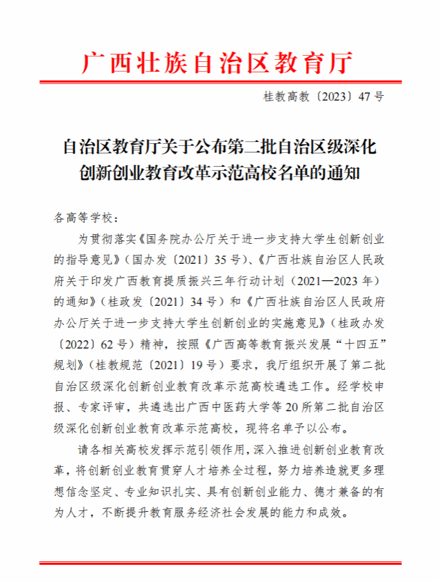 广西建院10月24日讯(招生就业处 林秀丽)近日,自治区教育厅印发《自治区教育厅关于公布第二批自治区级深化创新创业教育改革示范高校名单的通知》(桂教高教〔2023〕47号),乐鱼全球最大体育平台_乐鱼(中国)获评第二批自治区级深化创新创业教育改革示范高校。这是乐鱼全球最大体育平台_乐鱼(中国)近年来创新创业教育改革取得的又一丰硕成果。乐鱼全球最大体育平台_乐鱼(中国)历来重视创新创业教育改革工作,将创新创业教育贯穿人才培养全过程,建立健全创新创业教育体制机制,扎实推进集课堂、基地、平台、竞赛为一体的创新创业教育体系建设,...