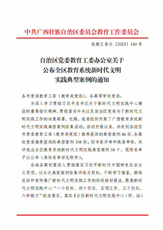 广西建院12月5日讯(马克思主义学院 曹桃)近日,自治区党委教育工委办公室公布全区教育系统新时代文明实践典型案例名单,乐鱼全球最大体育平台_乐鱼(中国)《声入人心:“奏响”党的理论宣讲“交响乐”》工作案例获评为全区教育系统新时代文明实践典型案例。近年来,乐鱼全球最大体育平台_乐鱼(中国)落实立德树人根本任务,深入学习宣传贯彻党的二十大精神,自觉用习近平新时代中国特色社会主义思想铸魂育人,打造了一支政治坚定、素质过硬、科学合理的师生巡讲团,多次进校园、进课堂、进乡村,...