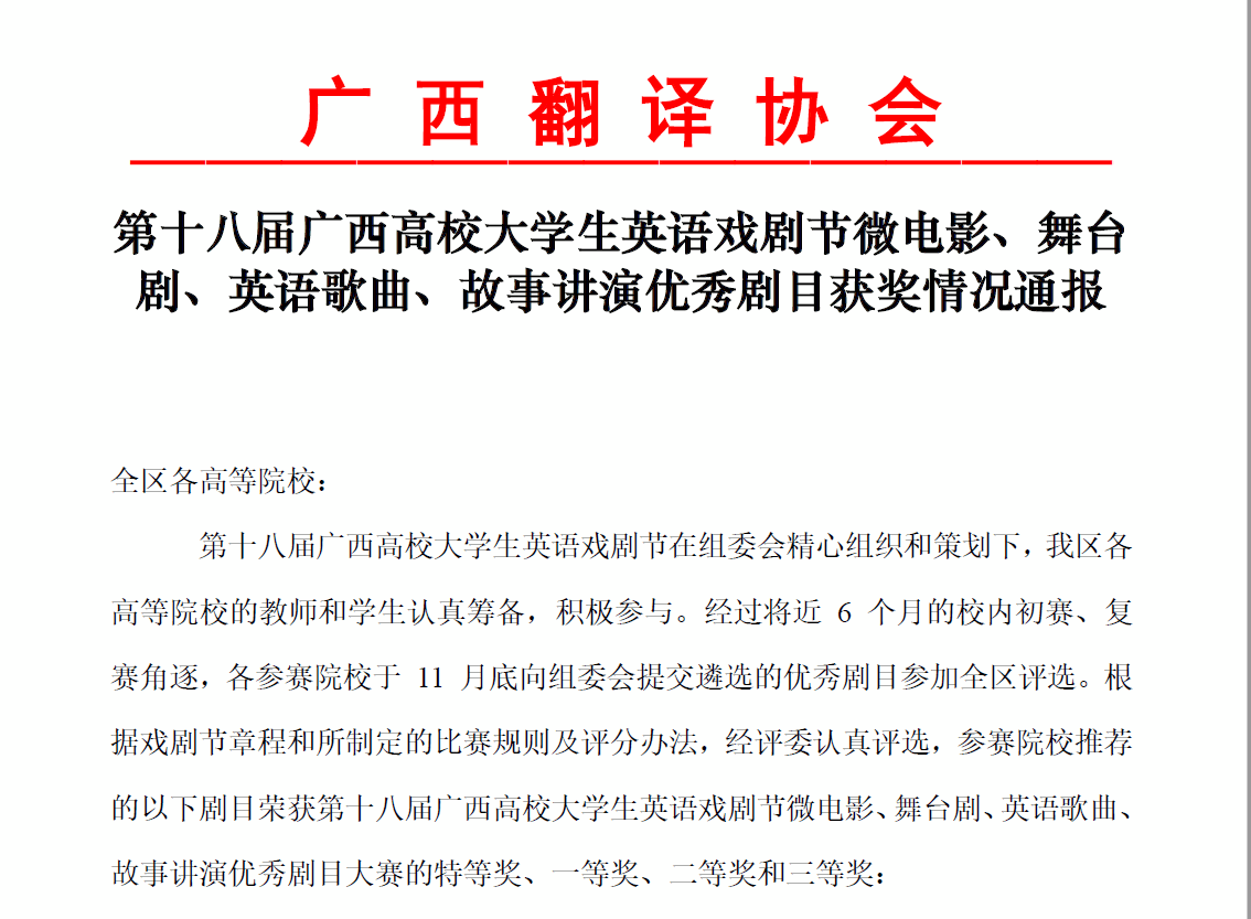 广西建院12月16日讯(人文教育学院 卢森源)近日,由广西高校外语教育研究专业委员会协同广西翻译协会主办的第十八届广西高校大学生英语戏剧节圆满落幕。在乐鱼全球最大体育平台_乐鱼(中国)英语教研团队的带领和人文教育学院卢森源老师的精心指导下,乐鱼全球最大体育平台_乐鱼(中国)与规划学院学子黄川越喜获故事讲演剧目特等奖,陈志杰、毛嘉慧斩获故事讲演剧目一等奖,江雨霏荣获歌曲演唱比赛一等奖。此番成绩刷新了历年来乐鱼全球最大体育平台_乐鱼(中国)参与该项赛事的最佳记录。 第十八届英语戏剧节获奖文件故事讲演剧目特等奖截图故事讲演剧目一等奖截图歌曲演唱剧目获一等奖截图特等奖剧目《...