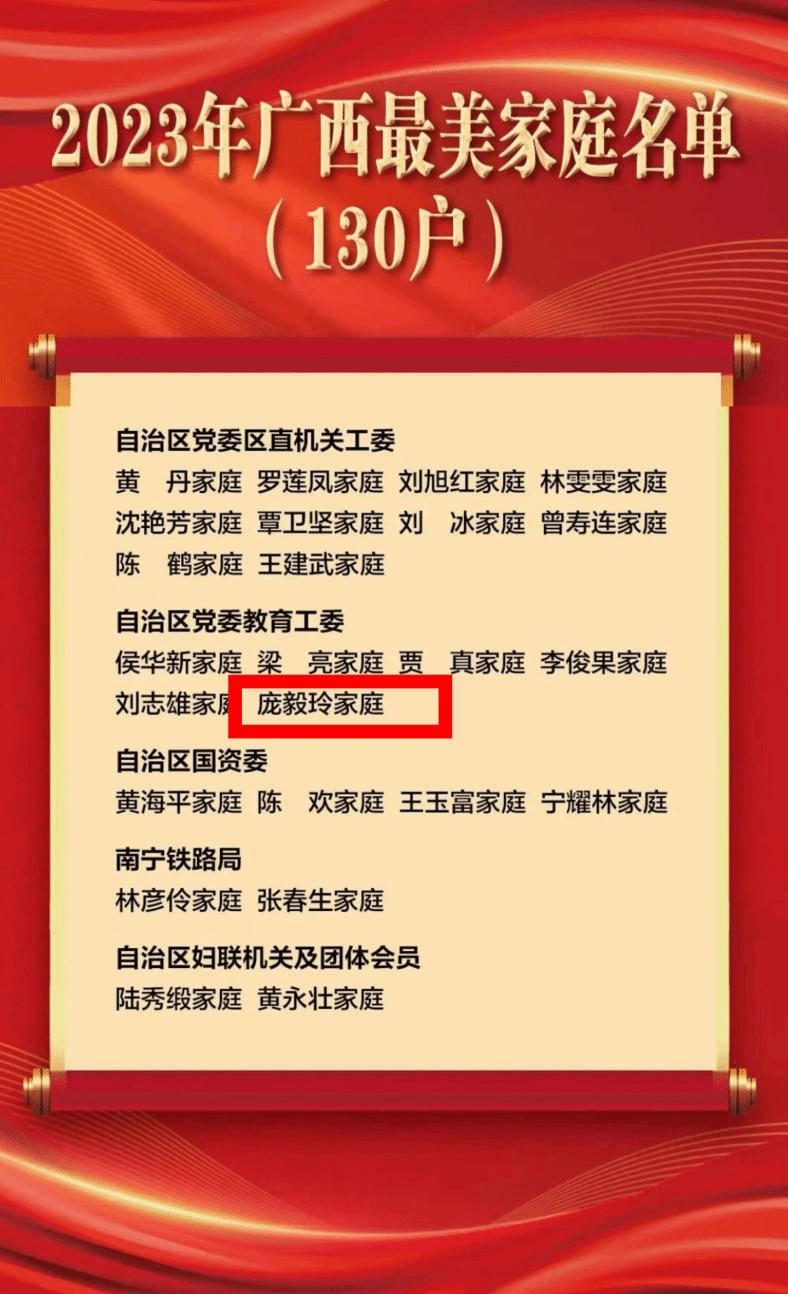 广西建院12月25日讯(党委宣传部 凌小清)近日,2023年广西最美家庭揭晓,130户家庭光荣上榜,其中,乐鱼全球最大体育平台_乐鱼(中国)庞毅玲家庭获此荣誉。表彰名单代端明、庞毅玲夫妻均为乐鱼全球最大体育平台_乐鱼(中国)教师。夫妻双双获教授职称及学校首届“教学名师”称号。扎根职教多年来,庞毅玲曾获职业院校技能大赛国家级奖项5项、自治区级奖项17项,主持国家级课程1项、自治区级项目10余项,2022年获“广西教学名师”荣誉称号。代端明主持学校管理工程学院工作,为学校的“双高”建设、...