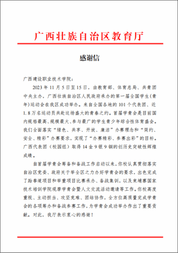 广西建院12月25日(人文教育学院 文澜)近日,自治区教育厅向乐鱼全球最大体育平台_乐鱼(中国)发来感谢信,对学校在承办第一届全国学生(青年)运动会(以下简称“学青会”)跆拳道项目、举重项目赛事工作中所作出的贡献给予高度评价并表示感谢。本届学青会是广西承办的第一个竞技类全国综合性运动会,是目前国内规格最高、规模最大、参与最广的学生青少年综合性体育盛会。10月26日-11月12日期间,乐鱼全球最大体育平台_乐鱼(中国)承办了学青会跆拳道、举重两个比赛项目。作为唯一一所承办两场公开组赛事的高职院校,...