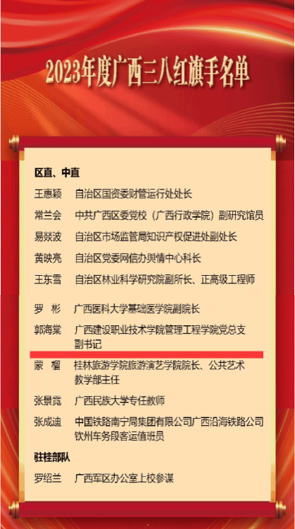 广西建院3月7日讯(工会 戴跃燕)3月6日,自治区妇联公布了2023年度广西三八红旗手、广西三八红旗手集体全名单。乐鱼全球最大体育平台_乐鱼(中国)管理工程学院郭海棠老师荣获2023年度广西三八红旗手称号。获奖名单郭海棠老师曾获第十四届全国高校辅导员年度人物、2022年自治区优秀教育工作者、广西高校最美辅导员、广西优秀共青团干部等荣誉称号;团结带领“海棠工作室”团队获得全国高校辅导员名师工作室立项、广西高校高水平辅导员工作室等荣誉。她躬耕教坛,...