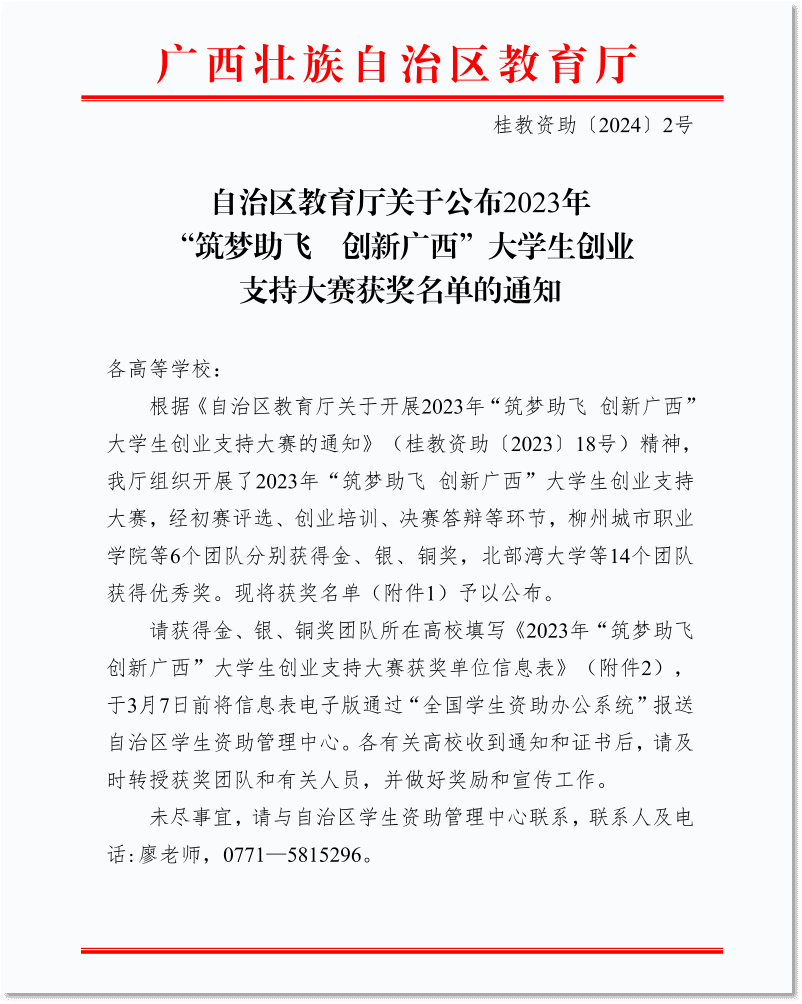 广西建院3月5日讯(党委学生工作部 文/杨栋 图/张红燕)近日,自治区教育厅公布2023年“筑梦助飞 创新广西”大学生创业支持大赛获奖名单,乐鱼全球最大体育平台_乐鱼(中国)学生钟鑫强、覃炳雄、王先栋、秦修华、韦成志、韦武护在教师张红燕、周伊含、冯光帆、周晓卉、欧嘉卡的共同指导下,参赛项目《“黑天鹅”钢筋网片绑扎仿生机器人》荣获优秀奖。获奖文件据悉,“筑梦助飞 创新广西”大学生创业支持大赛作为广西资助育人品牌项目已连续举办5年,获得社会广泛关注。...