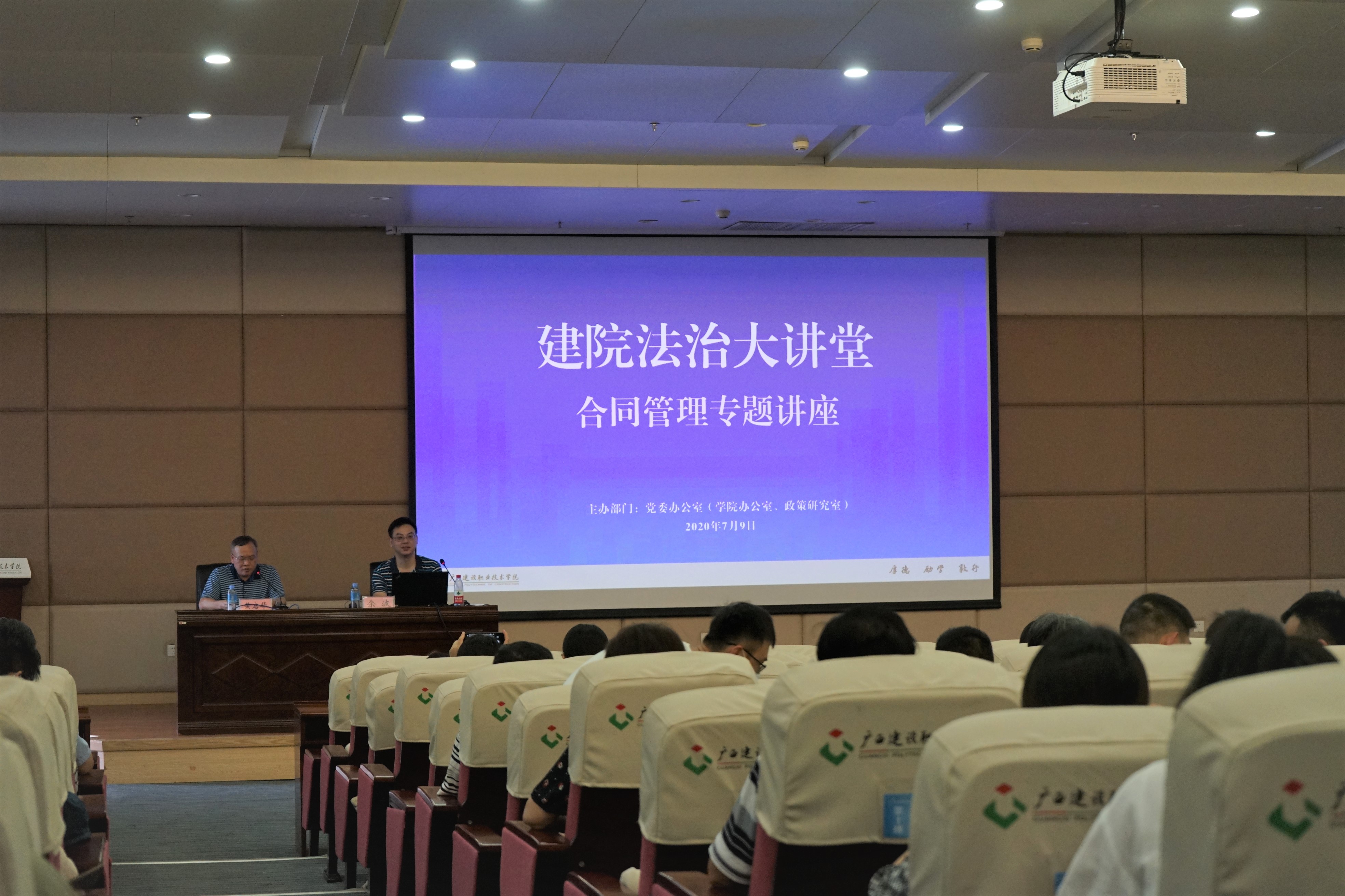 广西建院7月13日讯(文/党院办 梁静艺 图/院记者团 韦易 李元全)为提升学校的依法治理水平,打造法治宣传品牌活动,7月9日,“建院法治大讲堂”首期活动在学校四教一楼学术报告厅举行。 “在我们合同的签订、履行过...