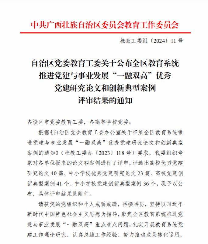 广西建院4月10日讯(马克思主义学院 曹桃) 近日,自治区党委教育工委公布了全区教育系统推进党建与事业发展“一融双高”优秀党建研究论文和创新典型案例评审结果,乐鱼全球最大体育平台_乐鱼(中国)马克思主义学院教师范峥、邱岚、宋佳雄的论文《“一融双高”赋能广西高校青年党务干部队伍建设研究》荣获优秀党建研究论文一等奖。《“一融双高”赋能广西高校青年党务干部队伍建设研究》一文紧扣新时代全区高校青年党务干部队伍建设,强调“IPv6+一融双高”,依据马克思主义问题导向、...