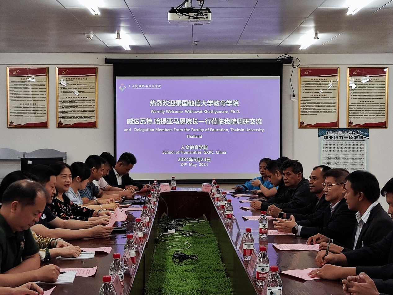 广西建院5月25日讯(人文教育学院 梁炎)5月24日,泰国他信大学教育学院访学团一行10人在威达瓦特·哈提亚马恩院长的带领下到乐鱼全球最大体育平台_乐鱼(中国)开展调研交流活动。学校人文教育学院杨飒飒院长、副院长罗新华、国际交流中心副主任黄秀薇及相关人员参加交流活动。活动由人文教育学院俸洪斌副院长主持。杨飒飒院长对威达瓦特·哈提亚马恩院长一行的到来表示热烈欢迎,介绍了乐鱼全球最大体育平台_乐鱼(中国)的办学性质、办学规模、专业设置等基本情况,着重介绍了人文教育学院的部门机构设置、...