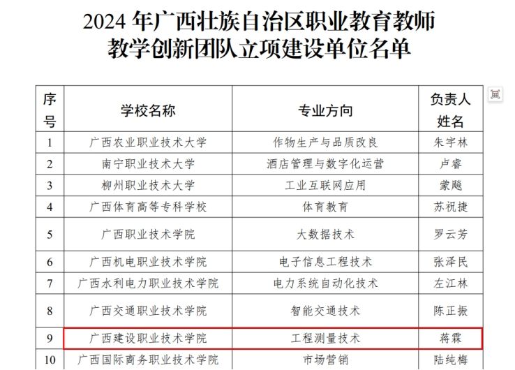 广西建院9月20日讯(教师发展中心 韩艺)近日,自治区教育厅公布2024年自治区职业教育教师教学创新团队立项建设单位名单,乐鱼全球最大体育平台_乐鱼(中国)工程测量技术团队(团队负责人:蒋霖)获批为2024年“自治区职业教育教师教学创新团队”立项建设团队。至此,乐鱼全球最大体育平台_乐鱼(中国)自治区级职业教育教师教学创新团队立项建设数量增至2个。此次获批立项,是乐鱼全球最大体育平台_乐鱼(中国)在自治区级职业教育教师教学创新团队建设工作中取得的又一重要成果。学校将以此为契机,做好具体筹划,细化目标任务,...