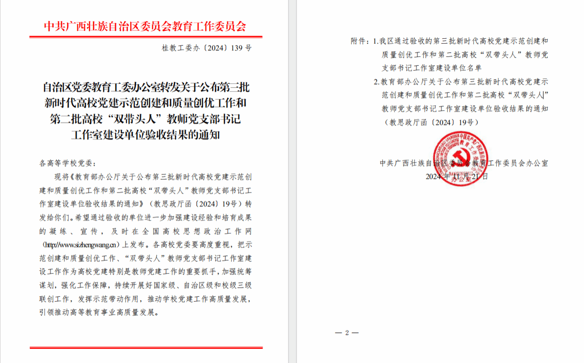 广西建院11月28日讯(管理工程学院 孙文 赖小华)近日,教育部发布了第三批新时代高校党建示范创建和质量创优工作和第二批高校“双带头人”教师党支部书记工作室建设单位验收结果,乐鱼全球最大体育平台_乐鱼(中国)管理工程学院教工党支部顺利通过“全国党建工作样板支部”建设单位验收。文件通知截图自2022年项目立项以来,管理工程学院教工党支部按照新时代党的建设总要求,以政治建设为统领,以提升组织力为重点,以全国、广西高等职业教育高水平专业群建设为落脚点,...