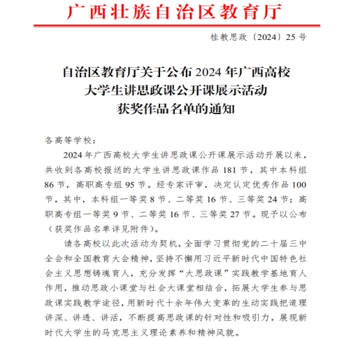 广西建院11月28日讯(马克思主义学院 宋佳雄)近日,自治区教育厅公布了2024年广西高校大学生讲思政课公开课展示活动获奖名单。乐鱼全球最大体育平台_乐鱼(中国)马克思主义学院思政课教师蒙文艳、潘柳虹团队参评的作品《以我之青春描绘壮美之乡村》,李倩老师团队参评的作品《如何提高人民军队打赢能力—朝着实现党在新时代的强军目标奋勇前进》均荣获高职高专组一等奖。据悉,此次评选活动是全面学习贯彻党的二十届三中全会和全国教育大会精神,坚持不懈用习近平新时代中国特色社会主义思想铸魂育人的重要举措。...