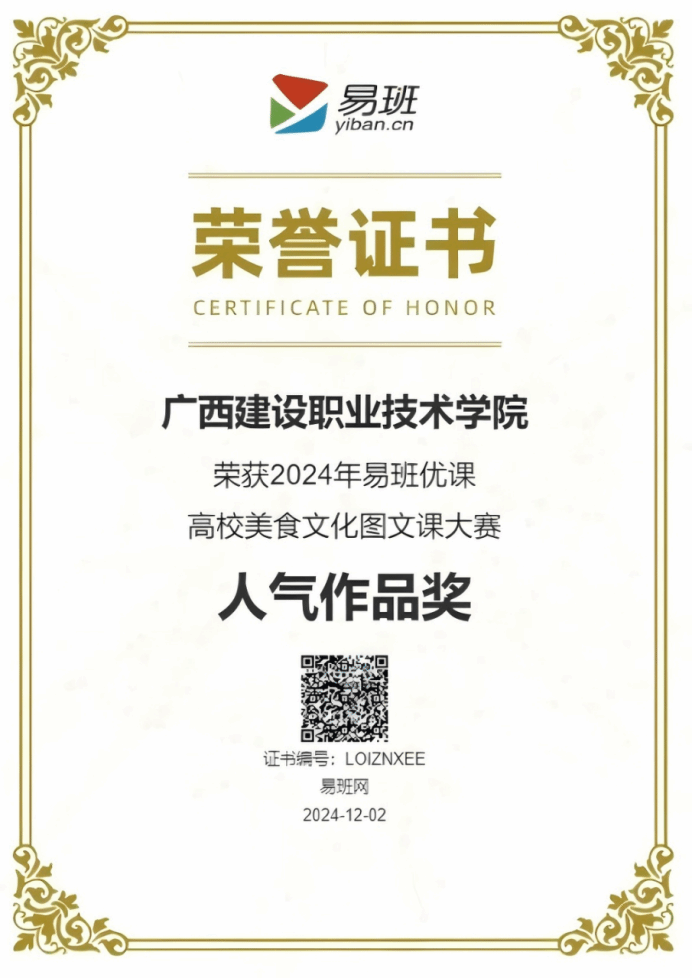 广西建院12月9日讯(党委学生工作部 刘晗蓓)近日,教育部易班发展中心公布了2024年易班优课高校美食文化图文课大赛评选结果,乐鱼全球最大体育平台_乐鱼(中国)选送的原创作品《带上有趣的饭搭子,做个幸福的建院人》荣获“人气作品奖”。作品以图文并茂、影音结合的方式为师生们献上一份校园美食攻略,受到师生广泛点赞、转发,校友评论“想念建院的美食了”“真的好吃”,引发强烈共鸣。本次活动共有全国23个省(区、市)和新疆生产建设兵团总计175所易班共建高校报名参赛,...