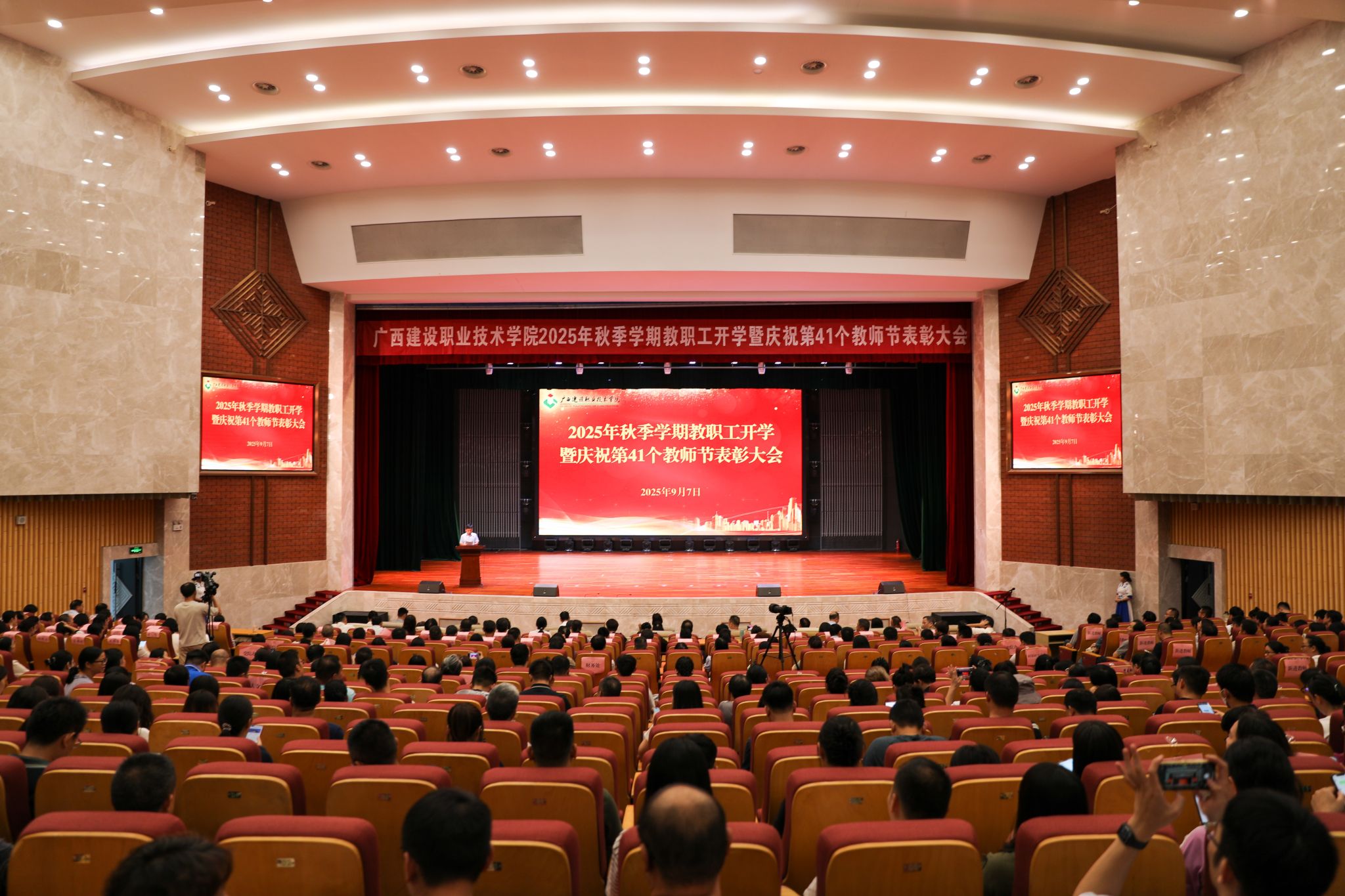 新征程风帆正举,新使命重任在肩。9月7日,乐鱼全球最大体育平台_乐鱼(中国)在礼堂召开2025年秋季学期教职工开学暨庆祝第41个教师节表彰大会。会议旨在表彰先进、树立榜样,进一步认识形势、凝聚共识、明确目标、压实责任、坚定信心,激励学校教职员工以更加昂扬的姿态投身学校高质量发展新征程之中。学校领导班子成员出席会议,全体教职工参加会议。大会现场学校党委书记刘晓红代表学校党委,向恪尽职守、辛勤耕耘在教学、科研、管理、服务一线的全体教职员工,...